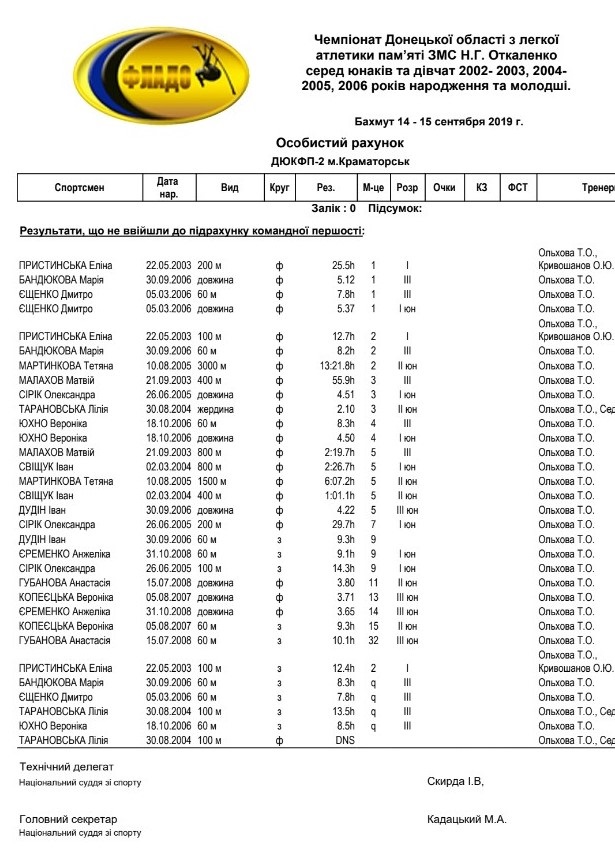 Команда легкоатлетів ДЮК ФП 2 м. Краматорськ 14-15.09.2019 у м. Бахмут взяла участь у Відкритому Чемпіонаті Донецької області пам’яті ЗМС Н.Откаленко серед юнаків та дівчат 2002-2003, 2004-2005, 2006 років народження та молодших. Наші спортсмени дуже добре показали себе у різних видах змагань, з ними можна ознайомитись у таблиці Особистого рахунку, яка додається з фото.